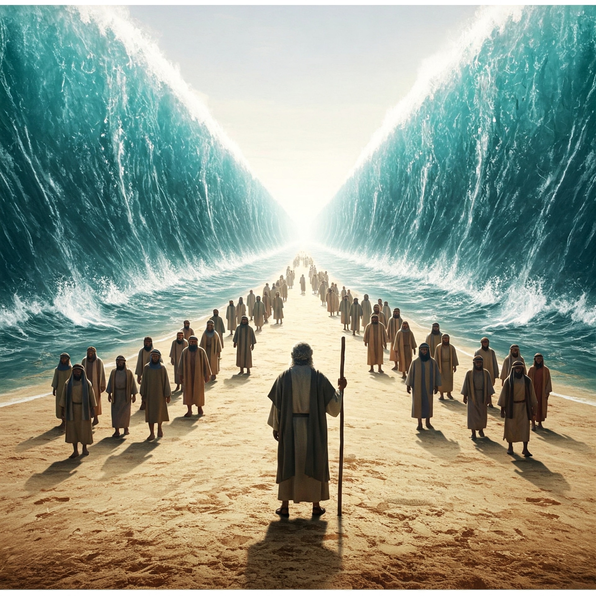 El Cruce del Mar Rojo: Perseguidos por el ejército egipcio, Dios abrió milagrosamente el Mar Rojo para que los israelitas pasaran en seco, y luego cerró las aguas sobre sus perseguidores (Éxodo 14).