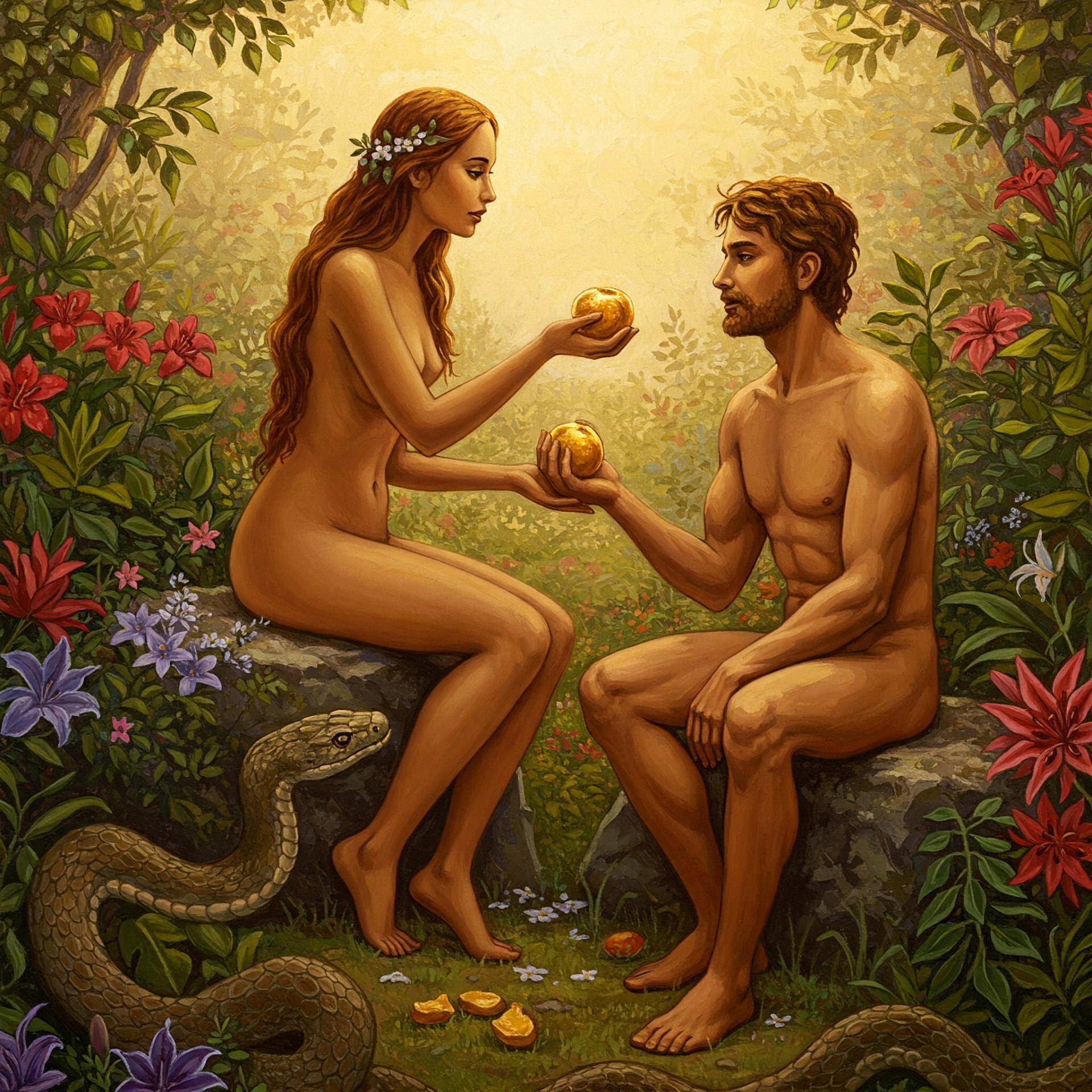 Deseo y Desobediencia: Eva ve que el fruto es bueno para comer, agradable a los ojos y deseable para alcanzar la sabiduría. Llevada por este deseo, toma del fruto y, luego también da a su marido, quien también come. (Genesis 3:6)